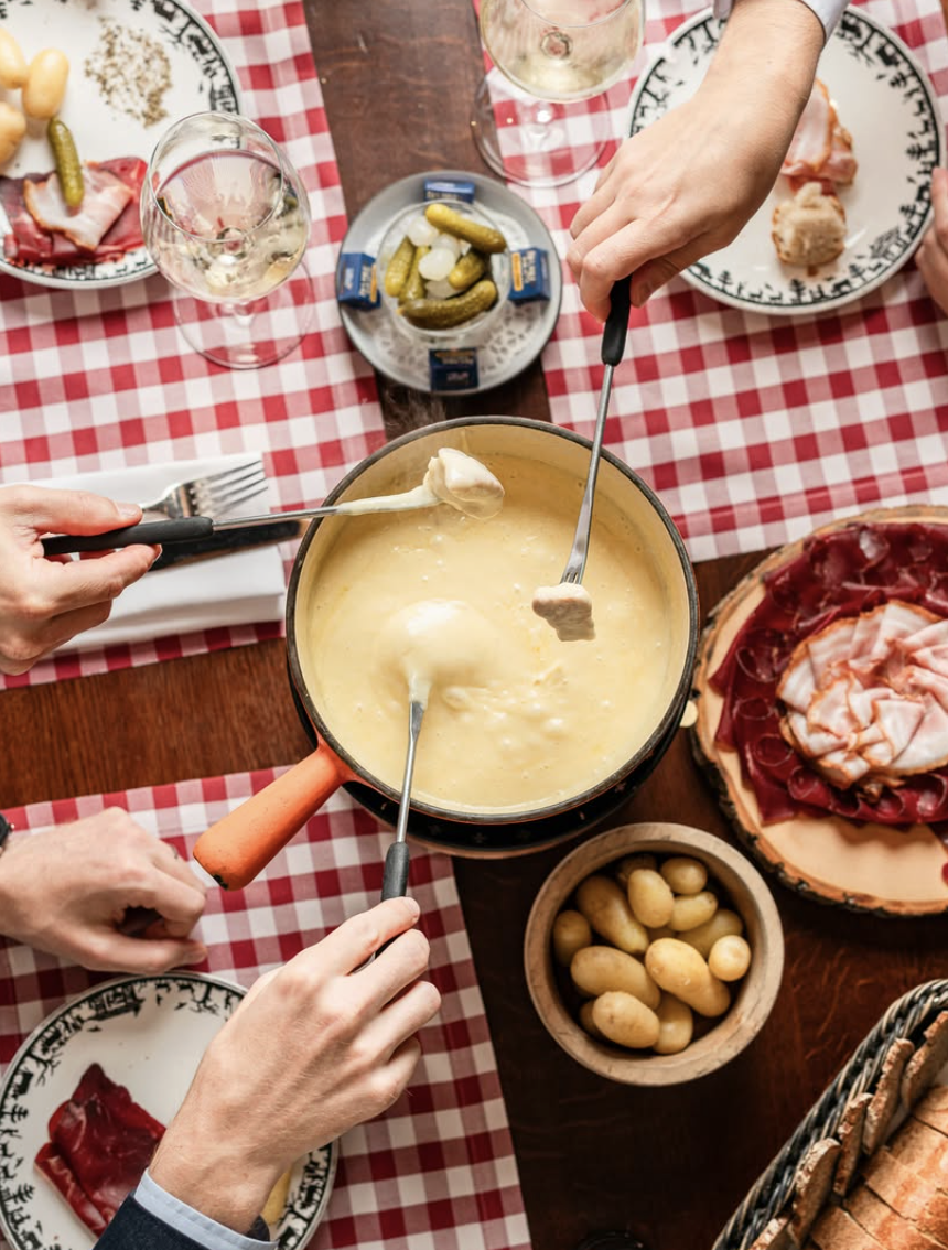 Melted cheese scraped over potatoes and pickles. Heavier than fondue and strongly seasonal in colder months.